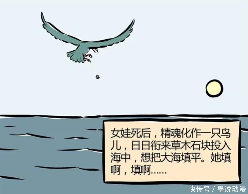 女娃死后,精魂变成了一只鸟,也就是现在的精卫。在那之后,精卫每天都要叼来草木石块丢进海里,就想将大海填平。可是大海无边无尽,不管精卫怎么努力,终究都做不到。不过精卫从未放弃,一坚持就长达五千多年。